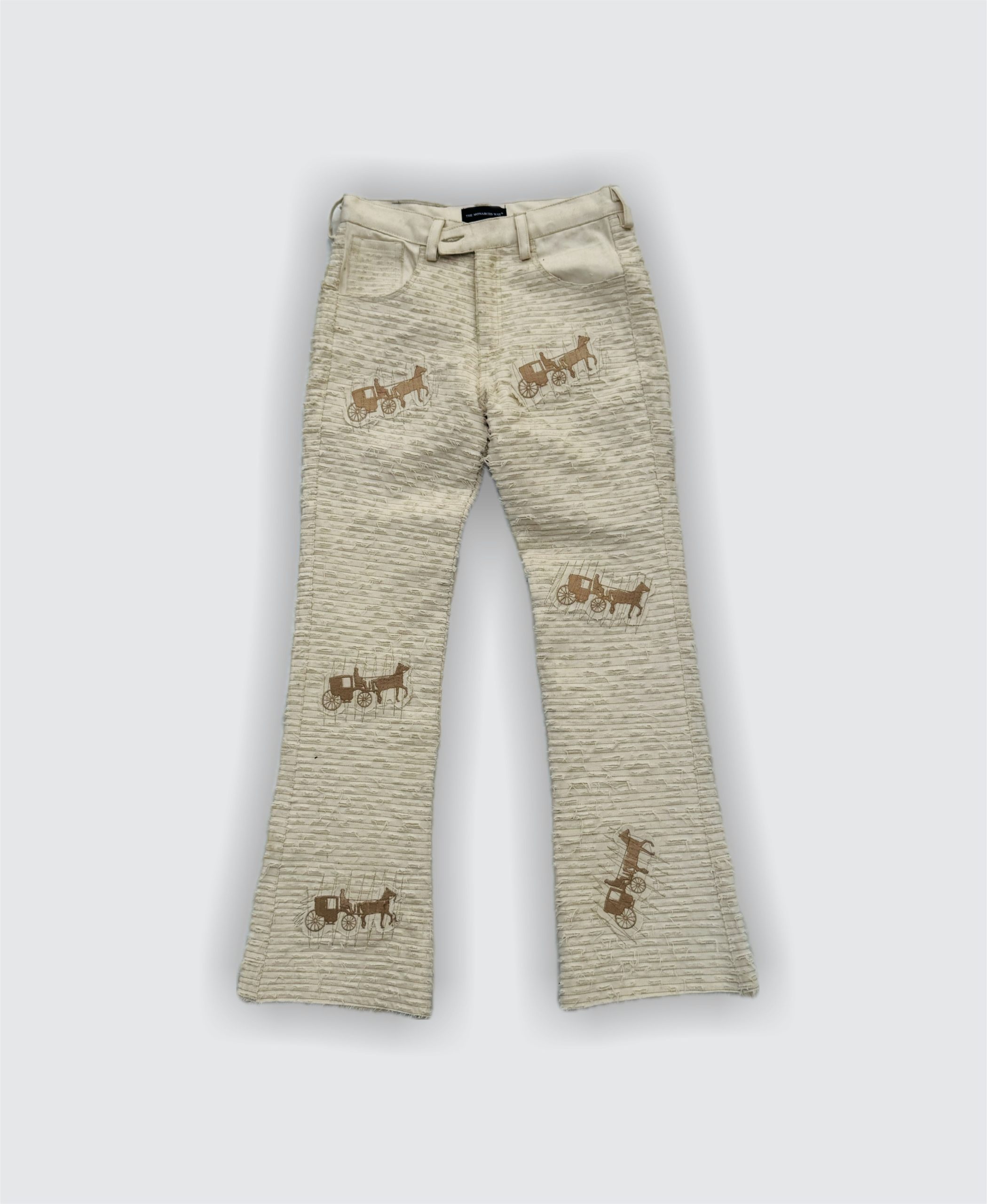 THE MONARCHS WAY The royal ride denim pants are made from 100% cotton and are boot cut fits, embellished with embroidered chariot, made from our signature technique. If you are trying to decide on the size you can follow our normal size for a standard fit. Processing and delivery takes 2-7 days within NIGERIA.